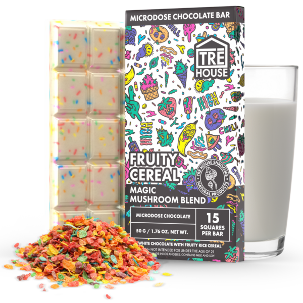 TRĒ House Fruity Cereal Magic Chocolate Bar blends nostalgic crunch with functional mushrooms in 12 creamy squares of euphoric, mood-boosting magic.